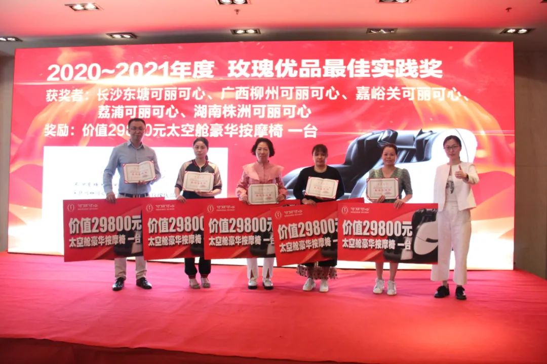 在本次会议中总部将“可丽可心2020-2021年度玫瑰优品最佳实践奖”授予长沙东塘可丽可心、广西柳州可丽可心、甘肃嘉峪关可丽可心、广西荔浦可丽可心、湖南株洲可丽可心,以表彰以上门店在玫瑰优品项目的实践过程中取得的卓越成就!玫瑰优品因具有独一无二的好效果,对身心灵滋养、修复和调理的特性以及超高的性价比,成为四减一逆龄中的关键项目,同时也是居家服务方案的核心项目!帮助顾客回归健康美丽,年轻5-10岁,多活10-20年不是梦!