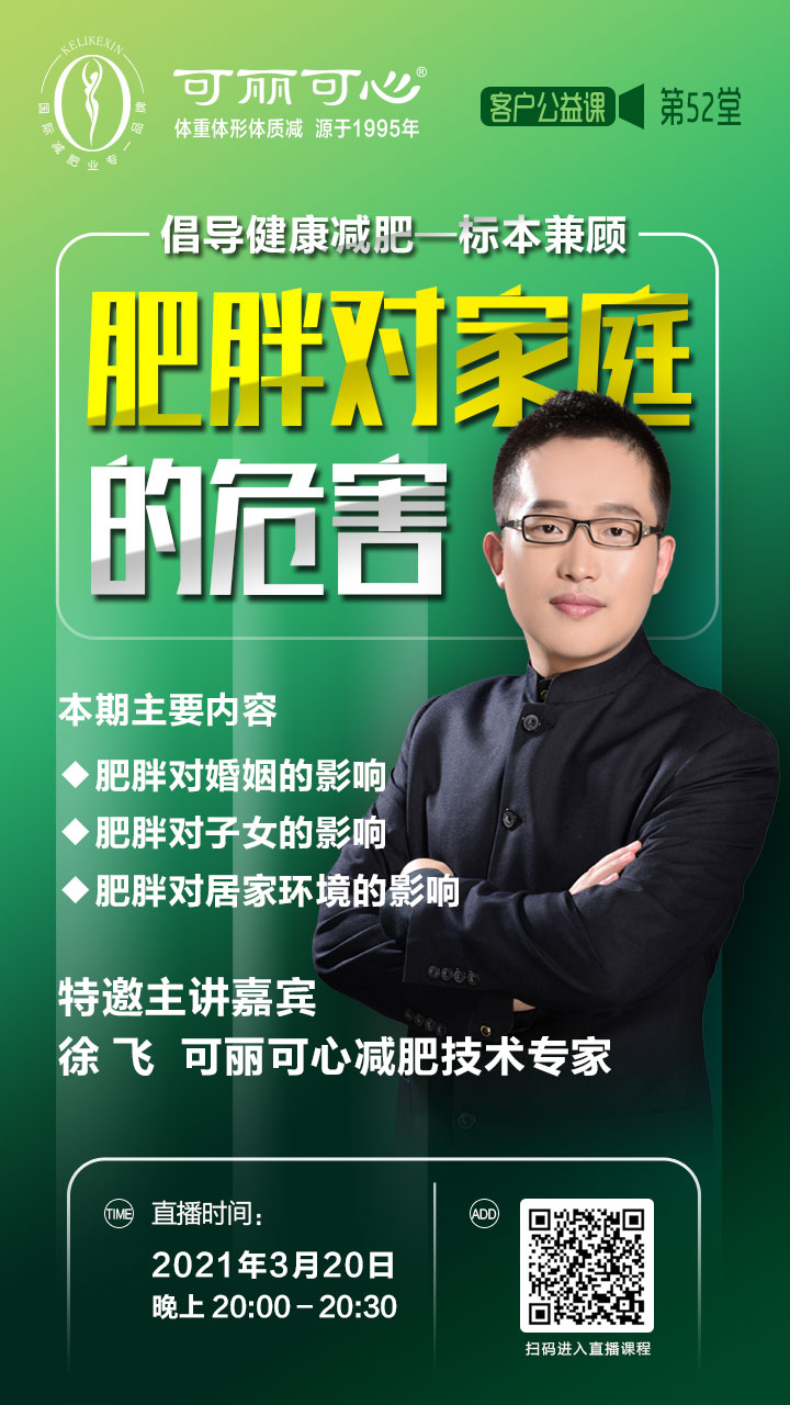 可丽可心线上公益课——肥胖对家庭的危害第52堂客户公益课 本期主要内容◆肥胖对婚姻的影响◆肥胖对子女的影响◆肥胖对居家环境的影响 特邀主讲嘉宾:徐 飞 可丽...